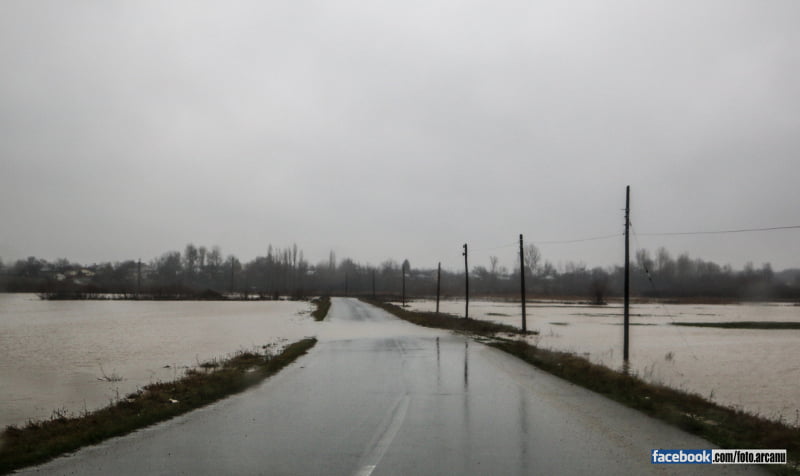 DJ 601 Crevedia Mare- Roata este circulabil, apa intrând pe o suprafaţă de 50 metri din drum şi având o înălţime de 10-15 cm.