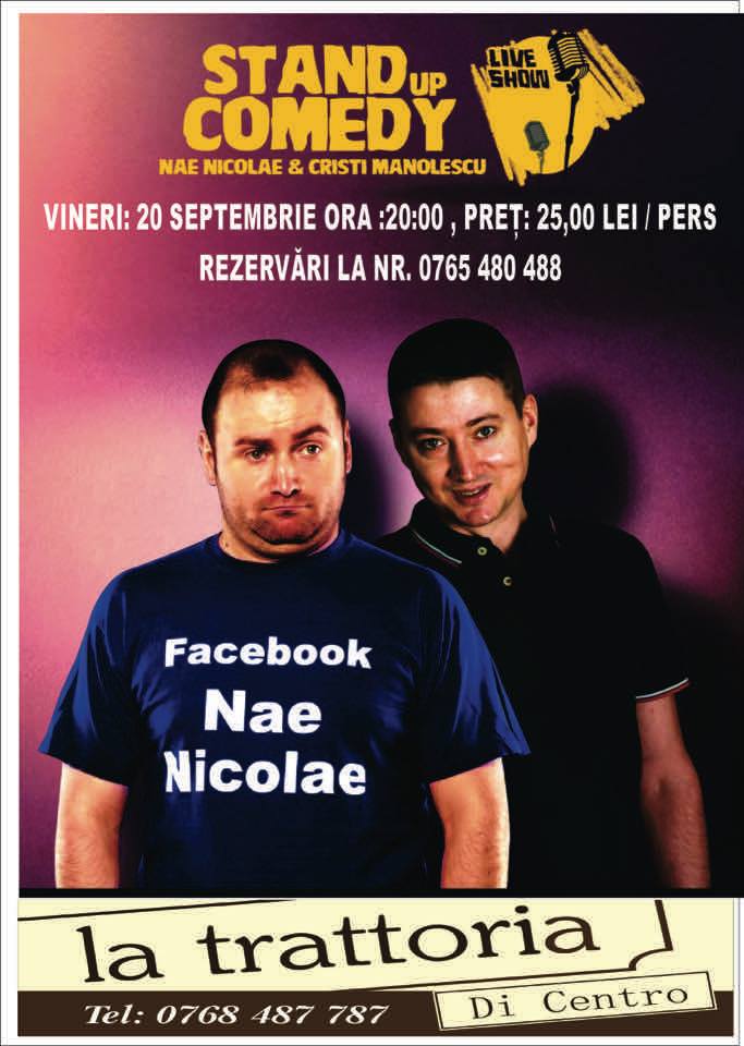 Comedianții Nae Nicolae și Cristian Manolescu vin la „Trattoria di Centro”, în Giurgiu, vineri, 20 septembrie a.c., unde vor susţine un Stand up Comedy.