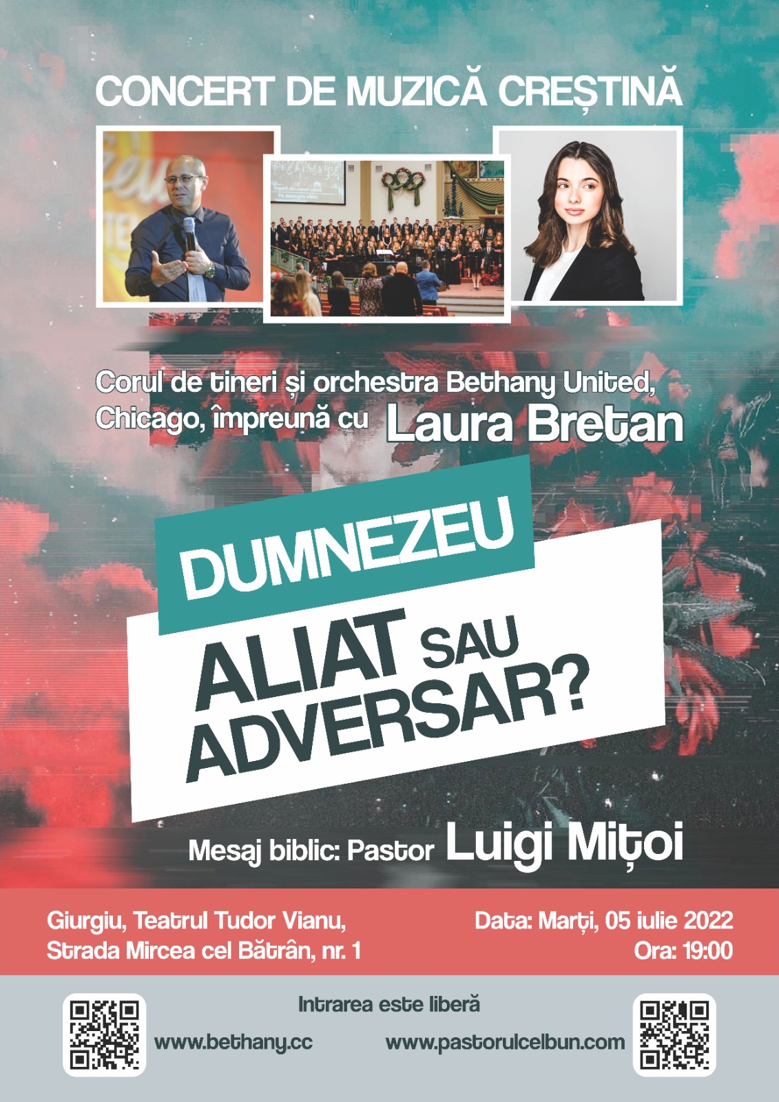 În municipiul Giurgiu, la Teatrul „Tudor Vianu”, va avea loc, marti, 5 iulie 2022, începând cu orele 19:00, un concert de muzică creştină susţinut de solista Laura Bretan, alături de corul de tineri şi orchestra „Bethany United” Chicago.