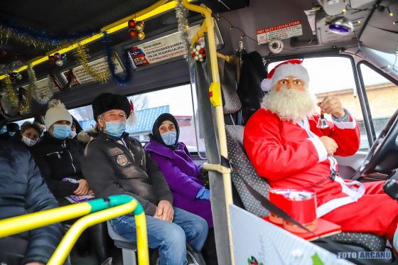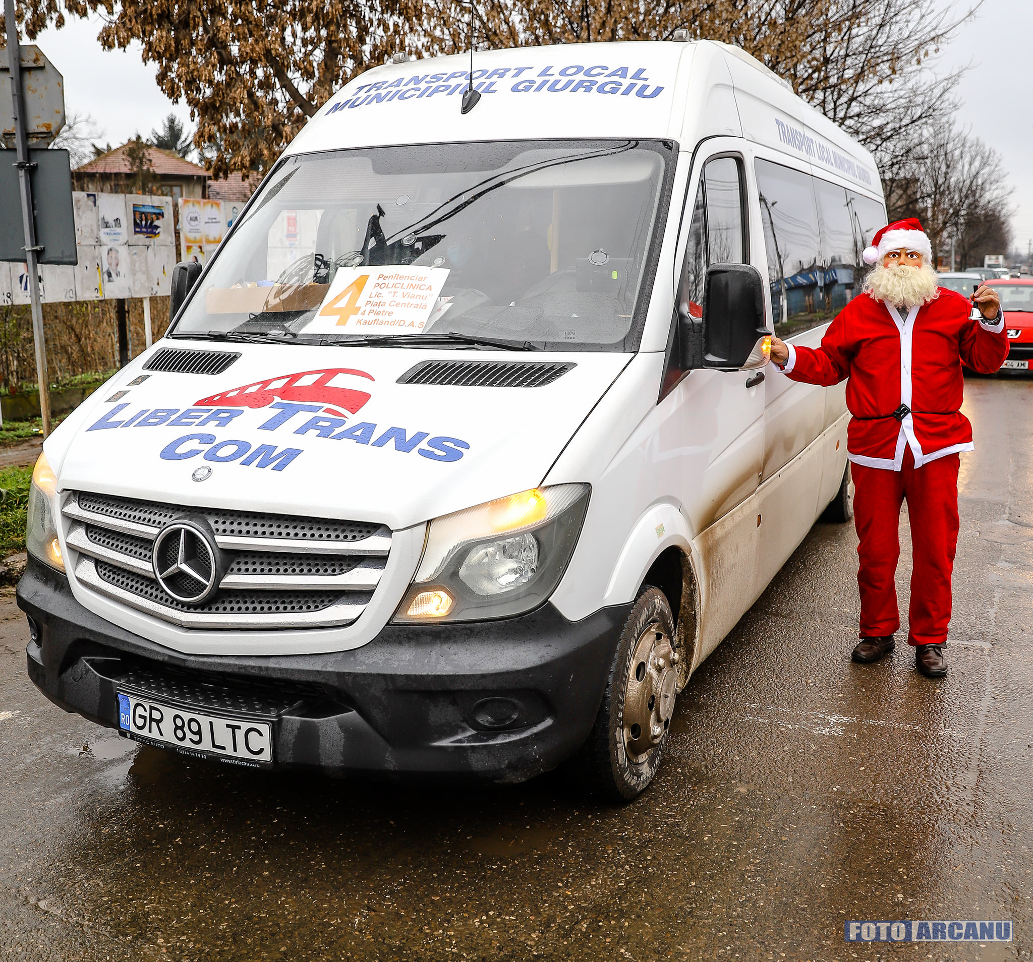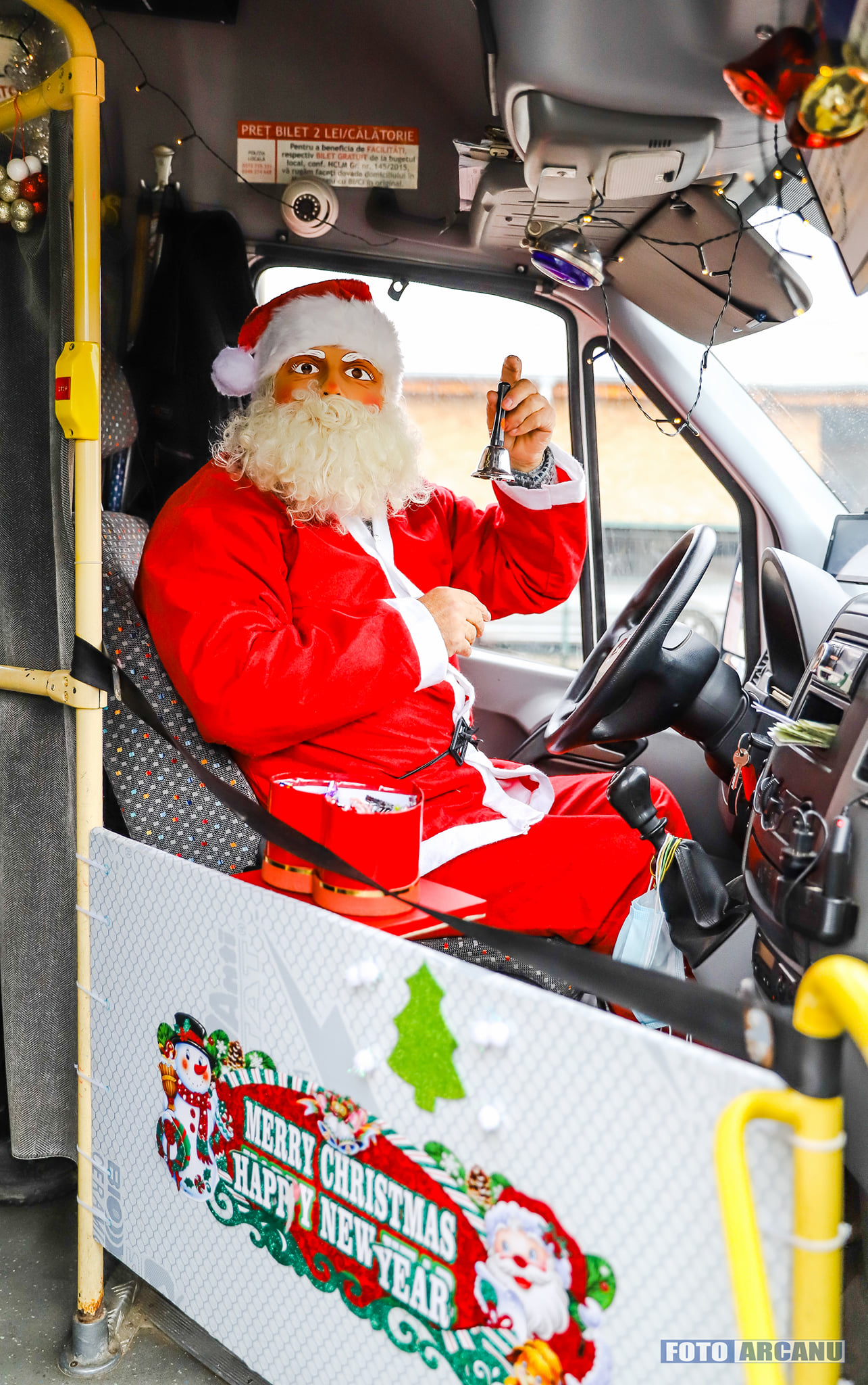 Unul dintre microbuzele aparţinând „Liber Trans Com” este condus de un Moş Crăciun, evident pe post de șofer, sosit tocmai de la Polul Nord.