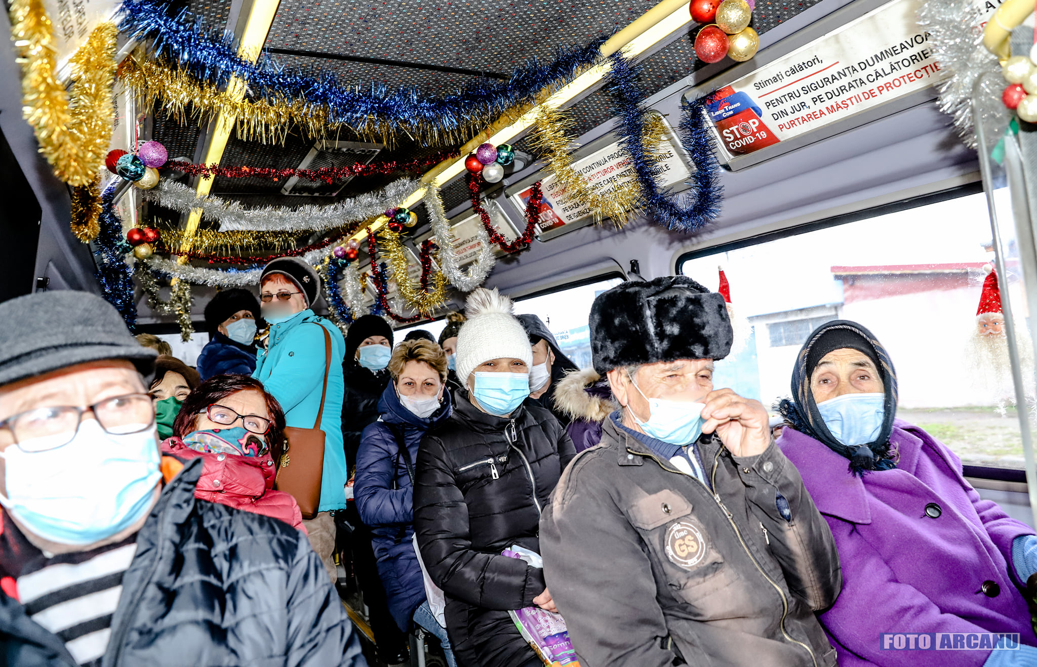 Nu lipsesc, bineînțeles, nici surprizele… astfel că pe lângă „decorul” adecvat, Moşul le oferă gratuit bomboane tuturor călătorilor!