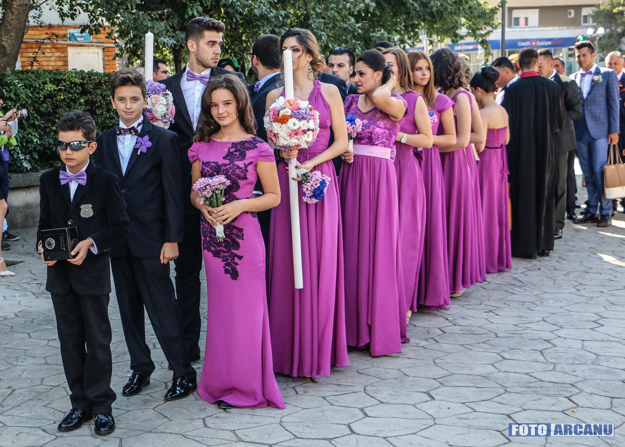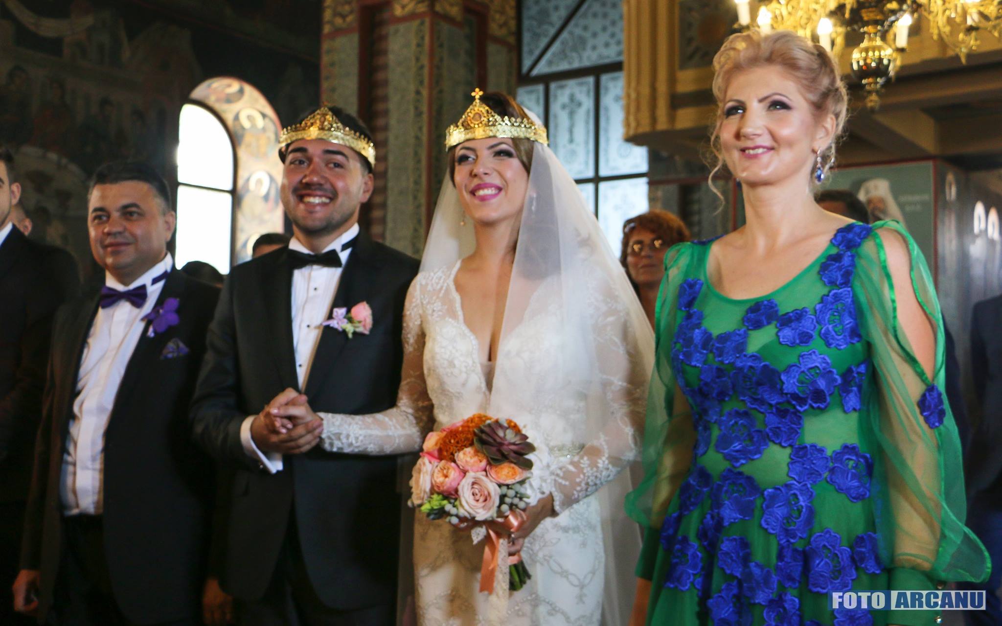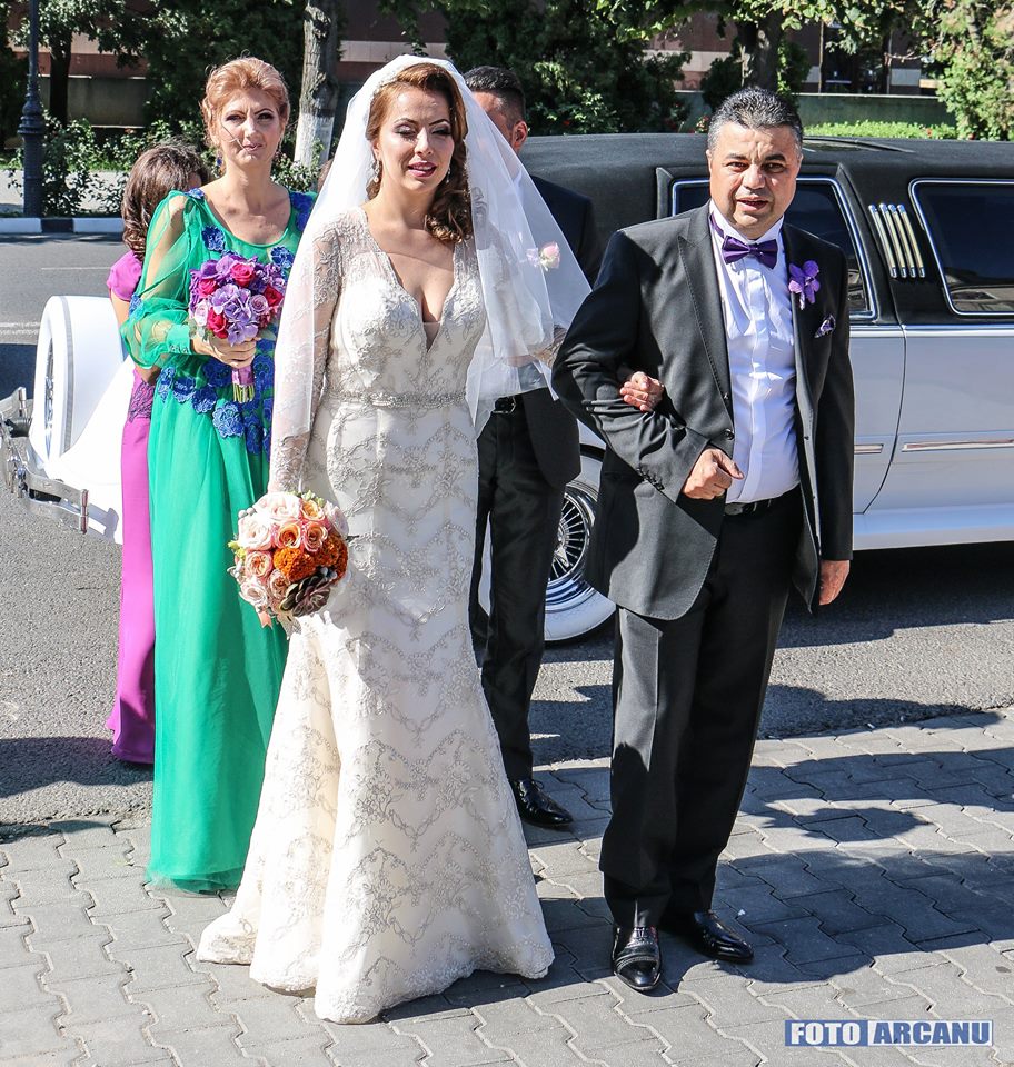 Radiind de fericire şi cu ceva emoţii, aşa şi-au făcut apariţia Adelina şi Bogdan Cărăbaş, însoţiţi de naşii lor, Elena şi Daniel Dinu, după ce au coborât dintr-o superba limuzină,
