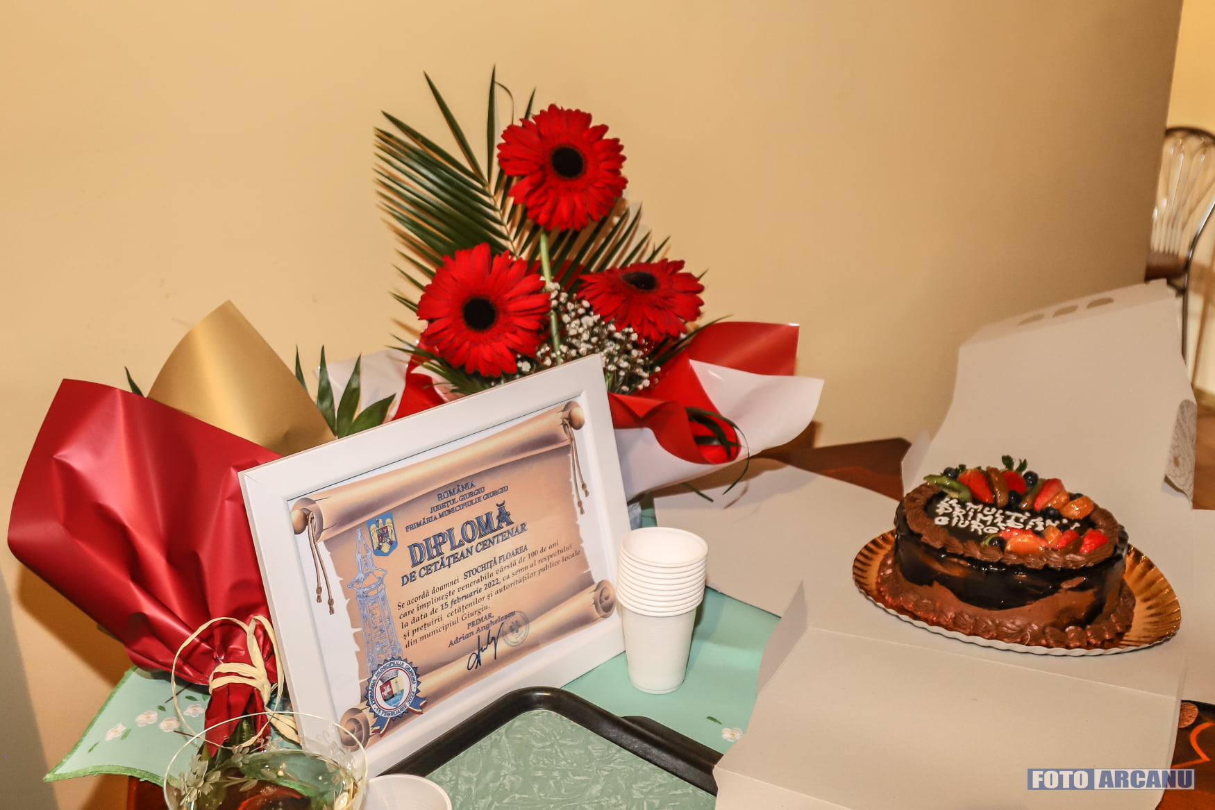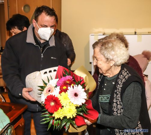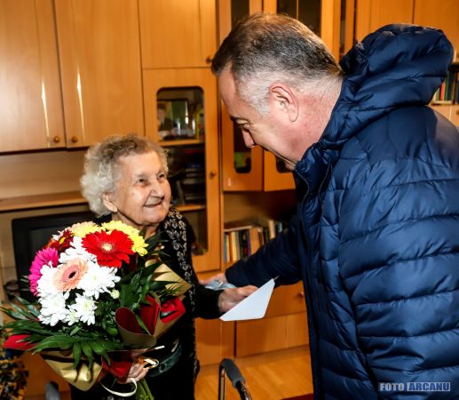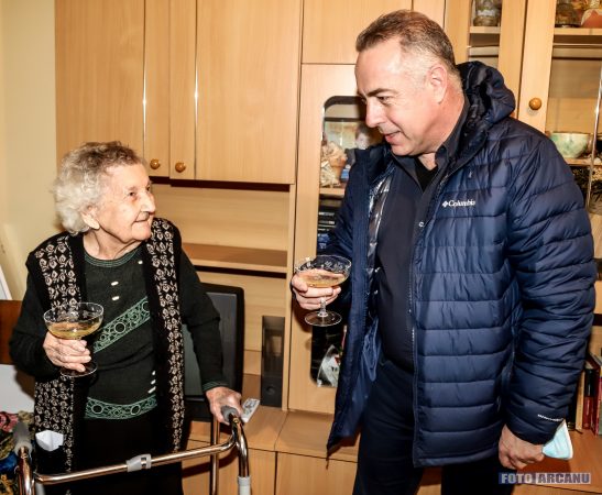 Primarul Adrian Anghelescu și Ionel Muscalu, administratorul public al municipiului, au vizitat-o, au conversat și i-au înmânat astăzi o diploma aniversară, un buchet de flori, un tort și un premiu în bani în valoare de 500 de lei.