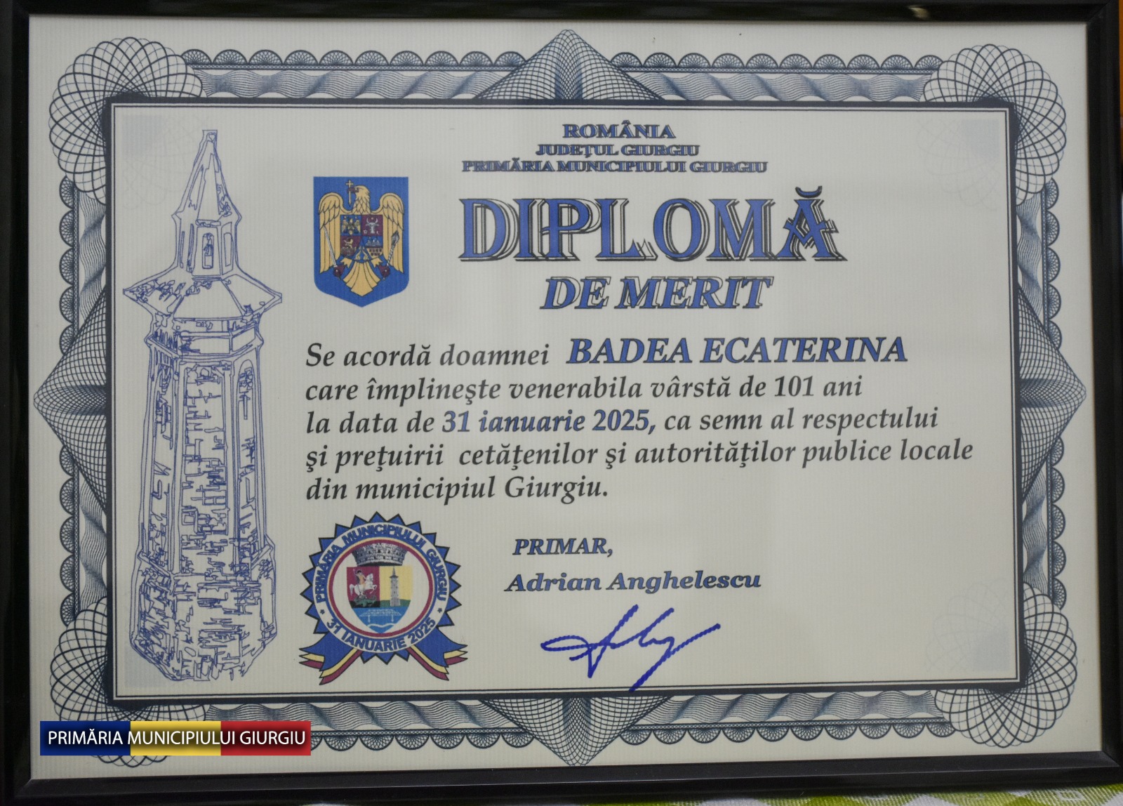 Din partea Primăriei Municipiului Giurgiu, doamna Badea a primit un tort, o diplomă, flori și suma de 1.000 de lei, ca semn de apreciere pentru întreaga sa viață.