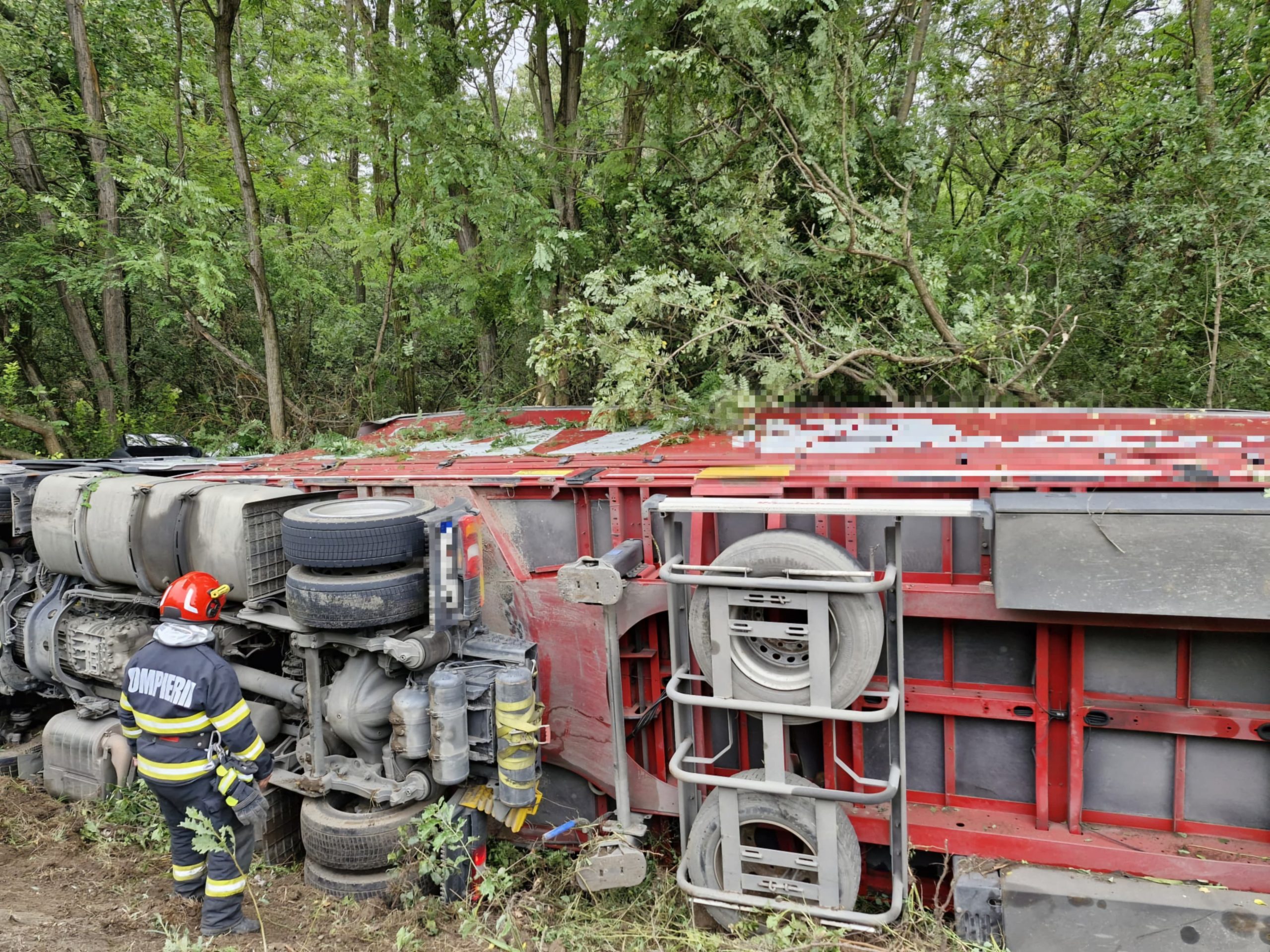 TIR răsturnat pe DN5B, în zona pădurii Bălănoaia