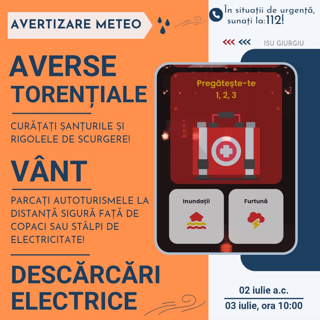 Județul Giurgiu se va afla sub o atenționare meteorologică de instabilitate atmosferică, în Continue reading