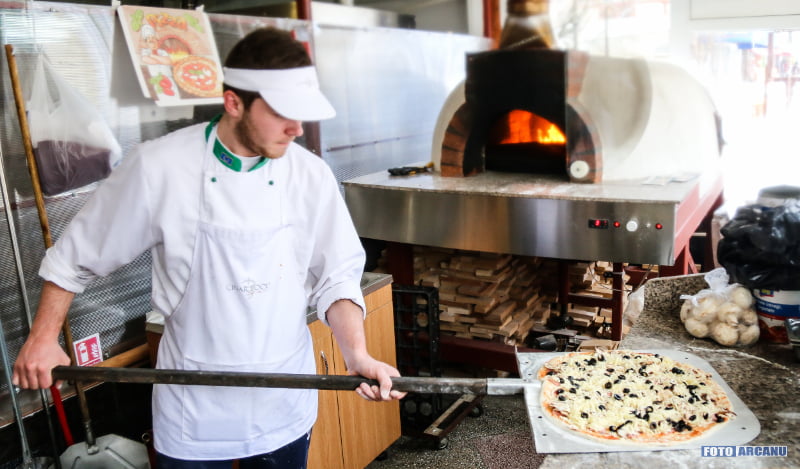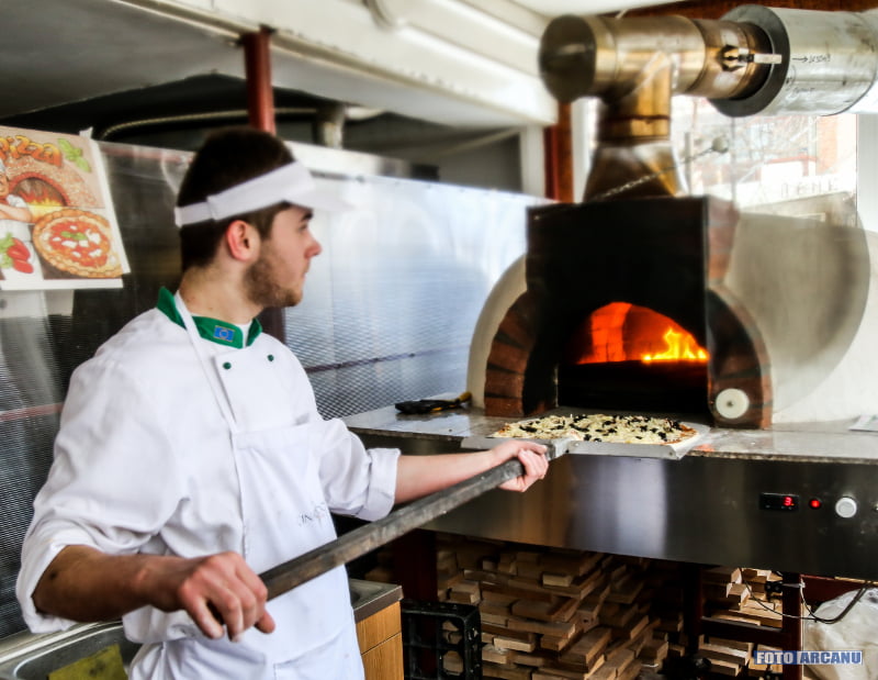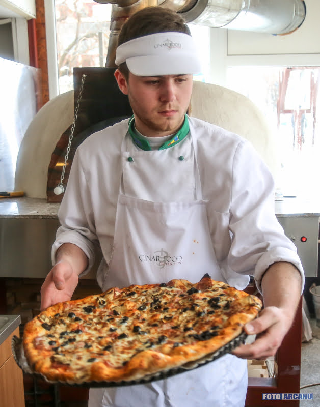 Pizza coaptă în cuptor de lemne cu lemne, pe vatră rotativă. Puteţi să comandaţi pizza cu ce vreţi!