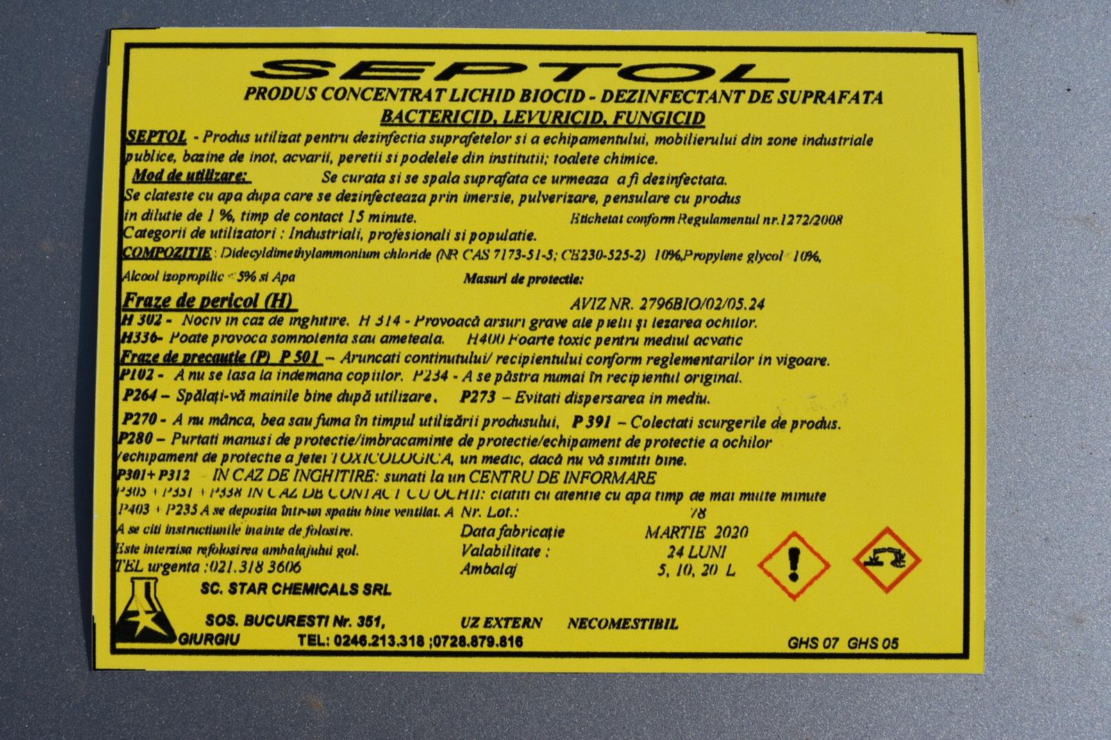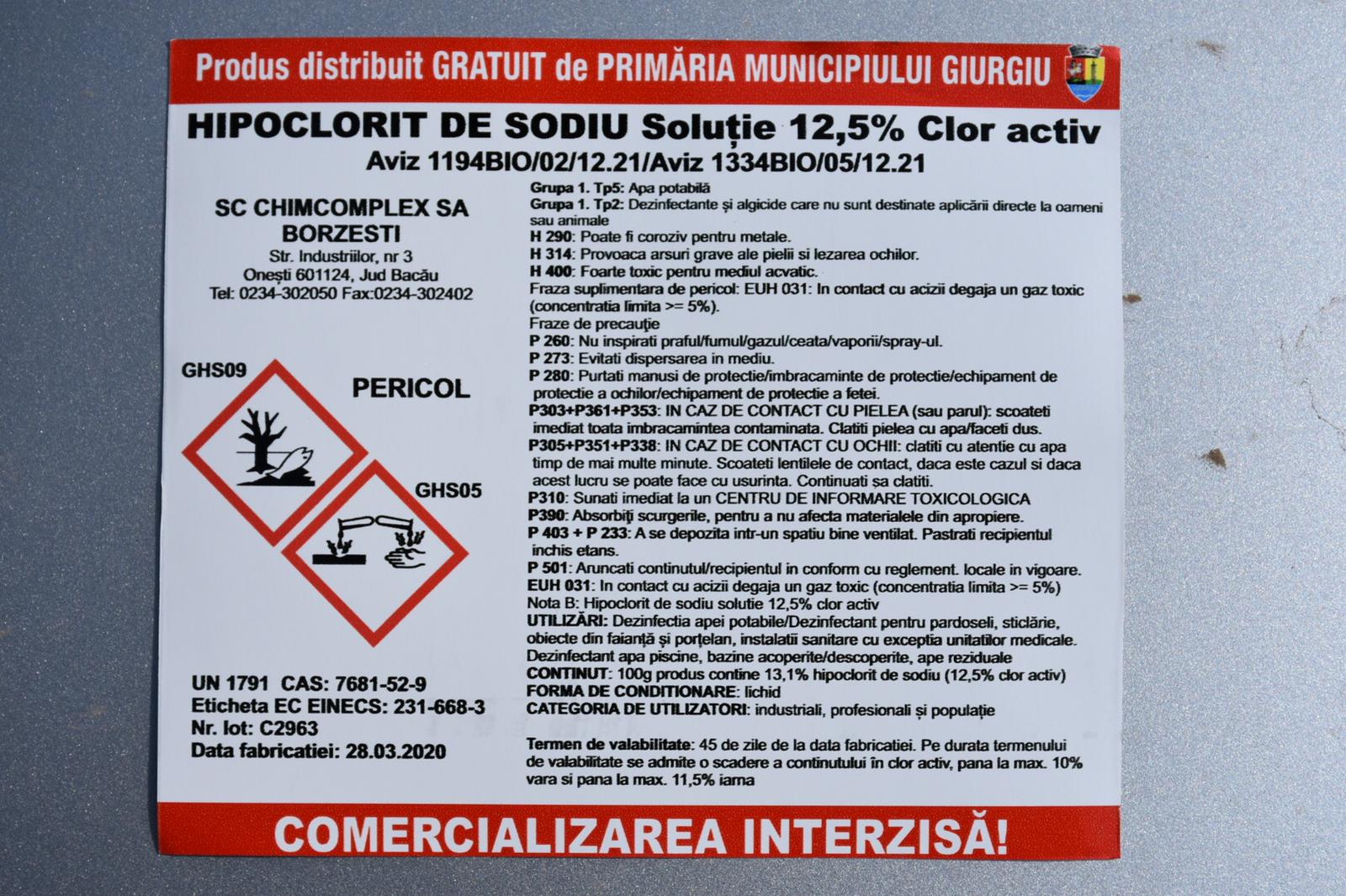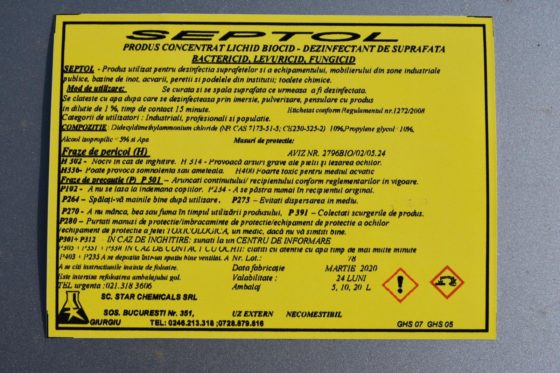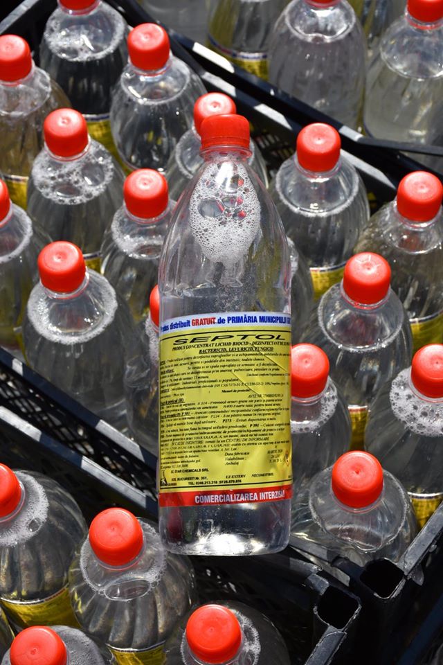 De asemenea, vor fi distribuite responsabililor de scări câte 1 litru de substanță dezinfectantă Hipoclorit, concentrație 1:50 l apă pentru umezirea periodică a covorașului și 1 l dezinfectant Septol, concentrație 1:100 l apă, pentru dezinfectarea scărilor și a balustradelor.