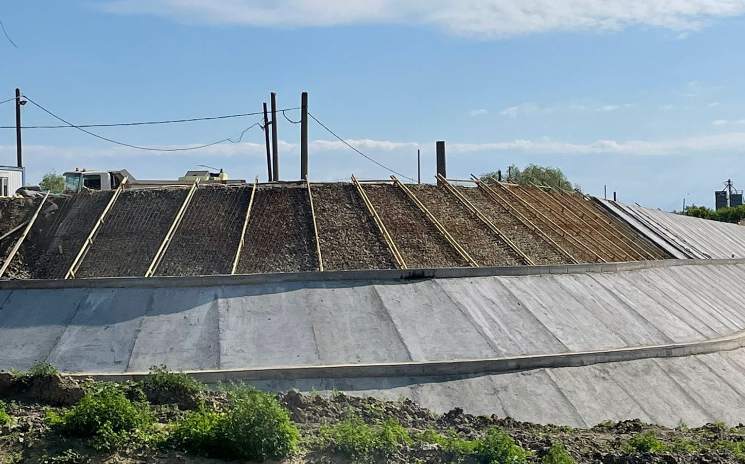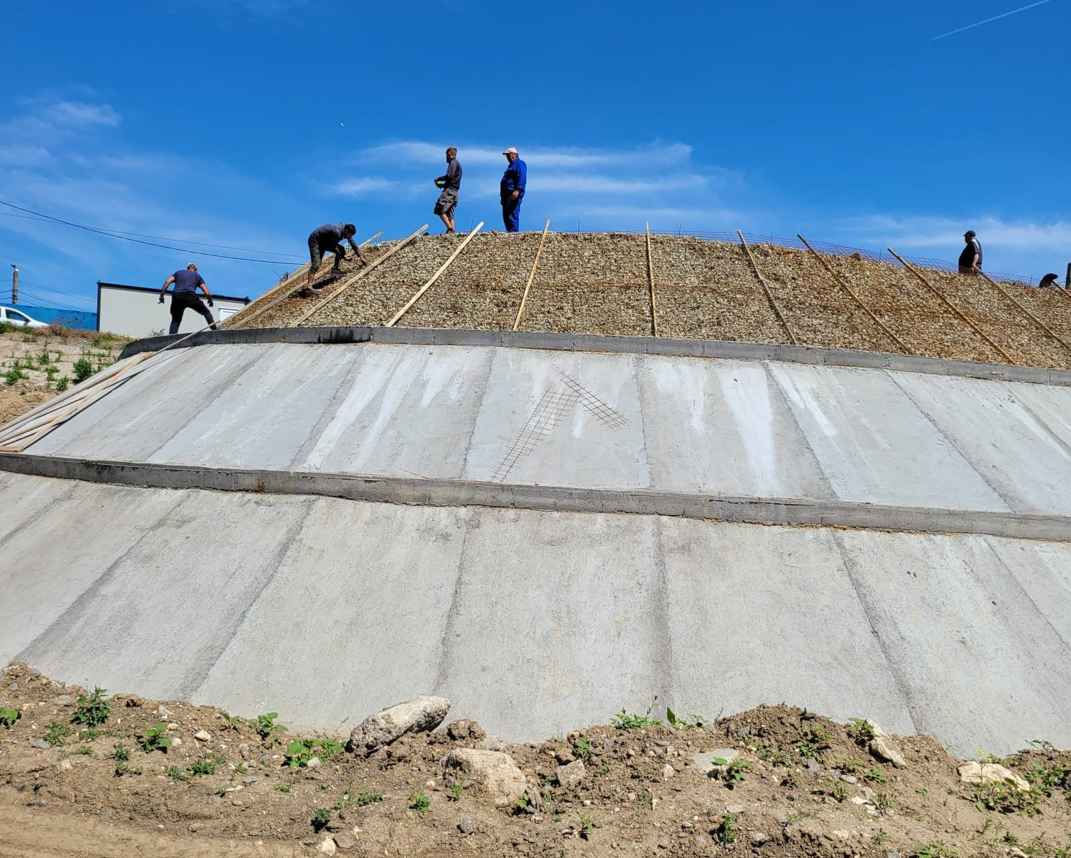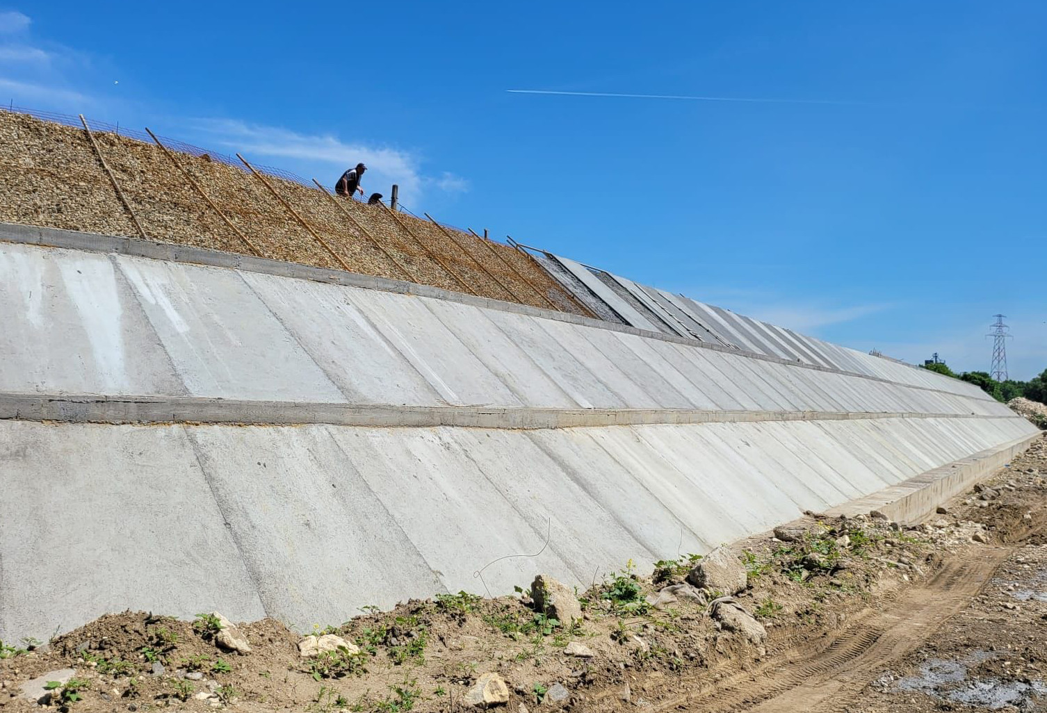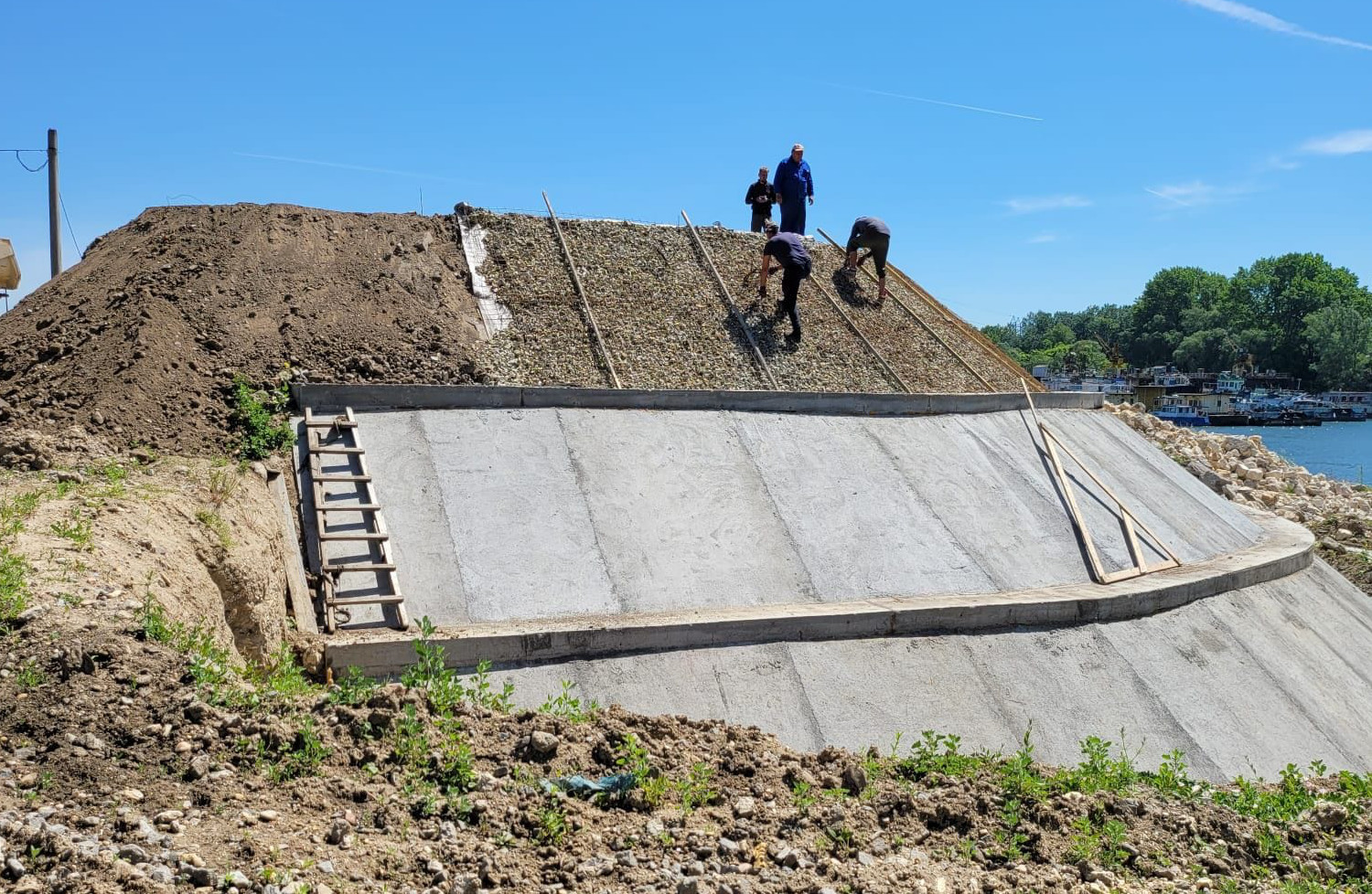 Lucrările sunt în plină desfășurare iar, potrivit constructorului, în această săptămână va fi finalizată cea de-a treia parte a pereului cu dale de beton și se va trece la finalizarea ultimei dintre cele trei grinzi de fixare. În maxim două săptămâni, va fi finalizată umplutura de pe platformă.