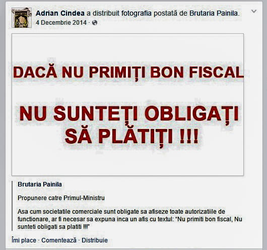 Adrian-Cindea„Dacă eşti PENSIONAR şi cumperi fără bon fiscal, eşti COMPLICE la furtul propriei pensii”, „Dacă eşti BUGETAR şi cumperi fără bon fiscal, eşti COMPLICE la furtul propriului salariu” „Dacă eşti PĂRINTE şi cumperi fără bon fiscal, eşti COMPLICE” la furtul alocaţiei copilului tău”!„Solicită bonul fiscal!” Este o campanie lansată de omul de afaceri Adrian Cîndea, patronul Brutăriei Pâinilă (de la parterul blocului 107, de lângă Centrul Medical Ema), susţinută (chiar şi în prezent) şi de cotidianul GIURGIUVEANUL.