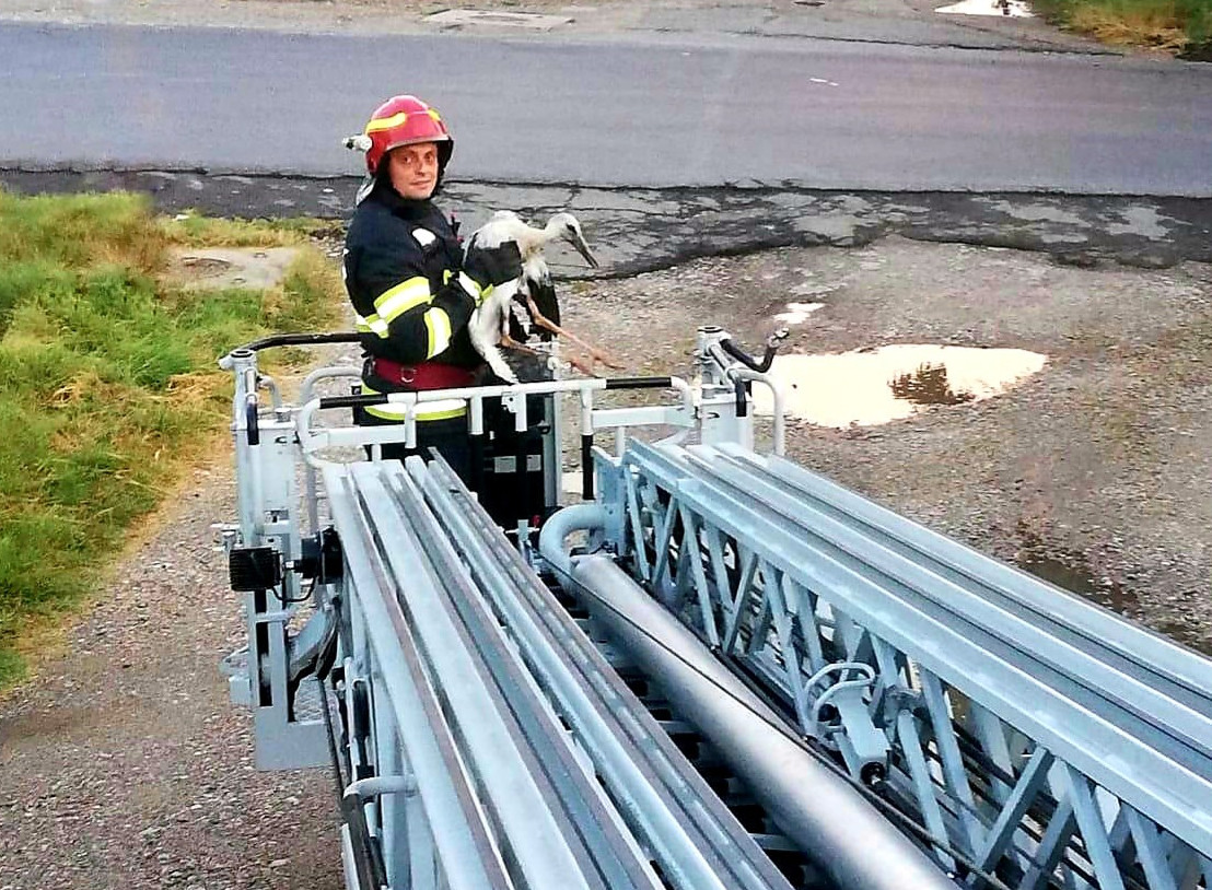 Un pui de barză, căzut din cuib, a avut nevoie de ajutorul pompierilor pentru a ajunge înapoi în locul pe care îl știa drept casă.