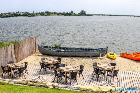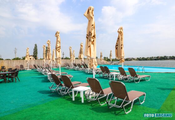 🌴 Zonă de plajă amenajată cu șezlonguri confortabile, perfectă pentru a te bucura de soare în timp ce admiri lacul