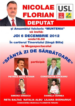 Dacă ai chef de o distracție bună chiar în ziua Sfântului Nicolae și vrei să fii alături de candidatul USL pentru Colegiul I Deputaţi, Florian Nicolae, ești așteptat cu drag, astăzi, la ora 16:00, în Cartierul Tineretului, lângă Billa!