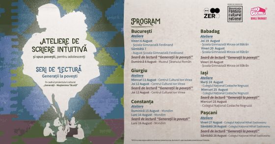În cadrul proiectului, va avea loc o serie de ateliere de scriere intuitivă și spus povești pentru adolescenți și adulții din viața lor. Atelierele din Giurgiu vor avea loc pe 11 și pe 12 august, la Centrul Cultural „Ion Vinea”, iar Seara de Lectură ”Generații la Povești” va fi în 12 August, în aceeași locație.