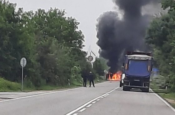 Potrivit primelor informații, o mașină a lovit frontal un camion greu în timp ce depășea, în urma impactului autoturismul luând foc.
