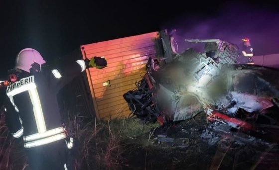 Când au ajuns echipajele, tirul era răsturnat pe o parte, capul tractor ardea generalizat, iar conducătorul auto surprins în interior nu a mai putut fi salvat.