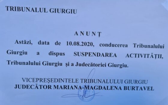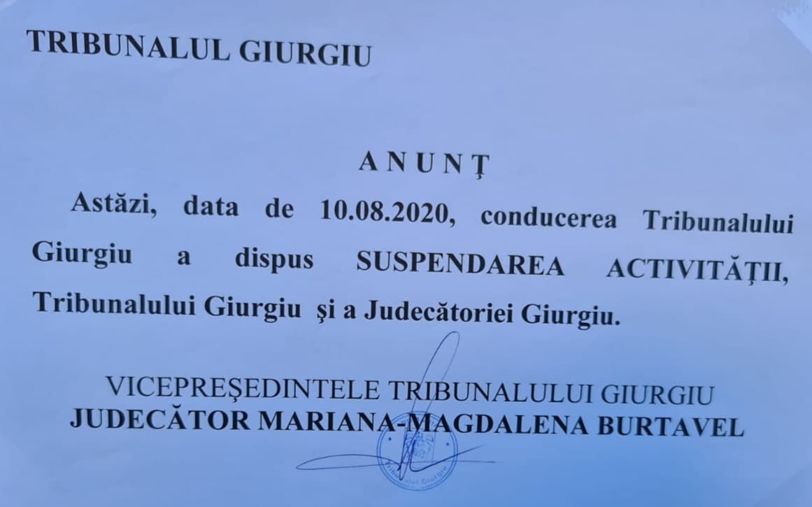 Astăzi, 10 august 2020, conducerea Tribunalului Giurgiu a dispus SUSPENDAREA ACTIVITĂŢII Tribunalului şi a Judecătoriei Giurgiu, potrivit unui anunţ emis de vicepreşedintele acestui for.