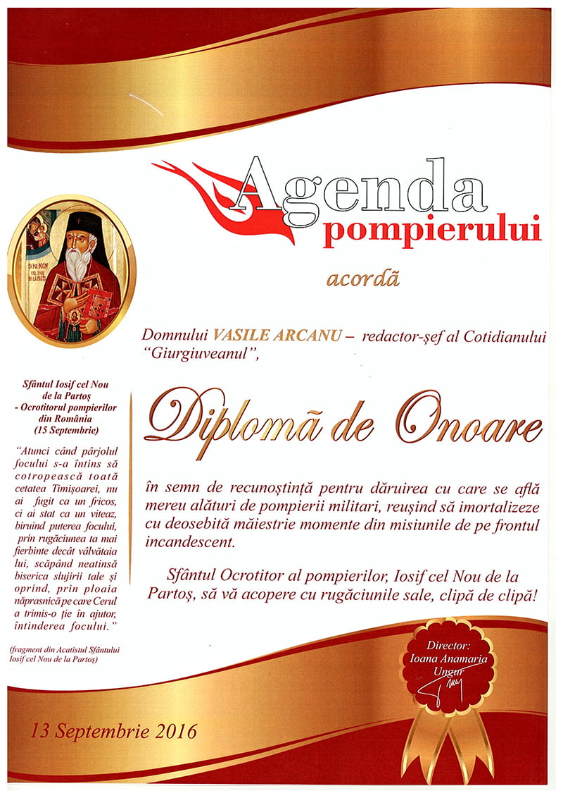 Astăzi, 13 septembrie 2016, de Ziua Pompierilor, la sediul Inspectoratului pentru Situaţii de Urgenţă „Vlaşca” al Judeţului Giurgiu, colegul nostru, Vasile Arcanu, redactorul şef al cotidianului „Giurgiuveanul”, a primit o „Diplomă de Onoare” din partea revistei „Agenda Pompierului”.
