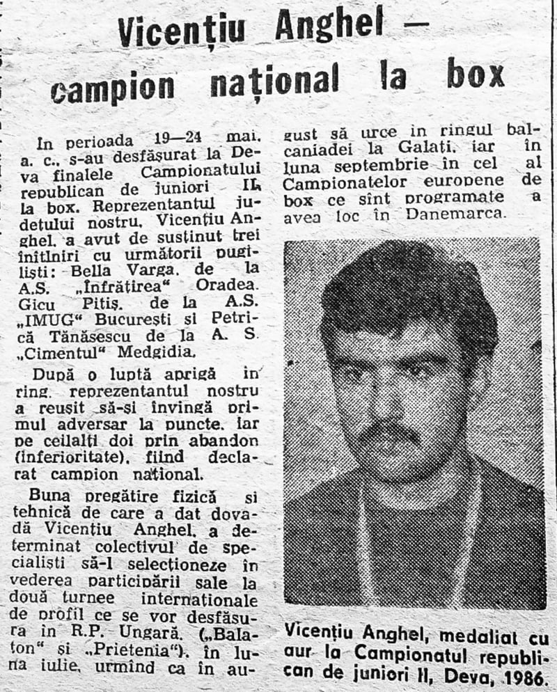 „După o luptă aprigă în ring, reprezentantul nostru a reuşit să-şi învingă primul adversar la puncte, iar pe ceilalţi doi prin abandon (inferioritate) fiind declarat campion naţional. Buna pregătire fizică şi tehnică de care a dat dovadă Vicenţiu Anghel, a determinat colectivul de specialişti să-l selecţioneze în vederea participării sale la două turnee internaţionale de profil ce se vor desfăşura în R.P. Ungară („Balaton” şi „Prietenia”), în luna iulie, urmând ca în august să urce în ringul balcaniadei la Galaţi, iar în septembrie în cel al Campionatelor europene de box ce sunt programate a avea loc în Danemarca”.