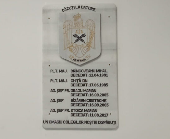 Totodată, la sediul Inspectoratului de Poliție Județean Giurgiu, din strada Călugăreni, nr.26, a fost amplasată o placă comemorativă, cu sprijinul Sindicatului Național al Polițiștilor și Personalului Contractual, în memoria polițiștilor giurgiuveni care și-au pierdut viața în timpul serviciului.